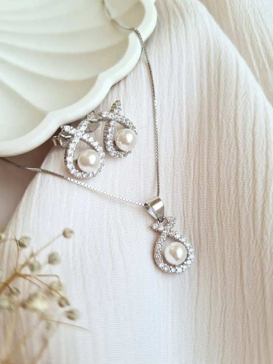 نیم ست کادویی به یادموندنی ای شامل نقره ۹۲۵ عیار و نگین اتمی (زیرکونیوم) با آبکاری طلا سفید (رادیوم). دارای فاکتور و شناسنامه رسمی مبنی بر اصل بودن نقره و عیار آن.